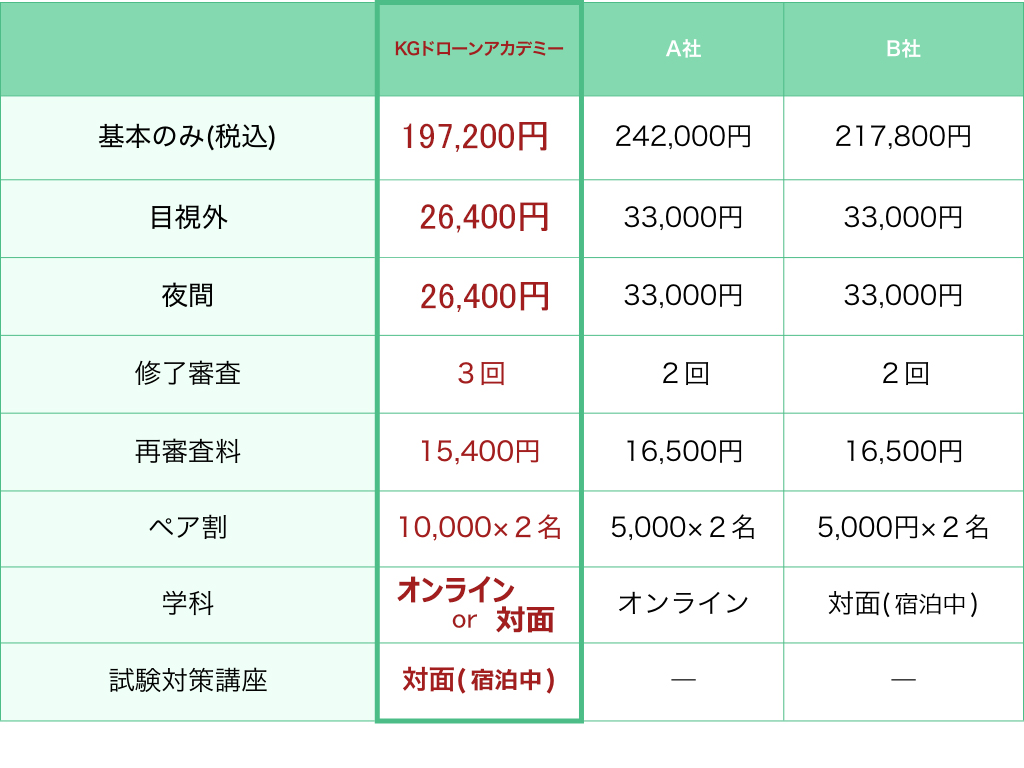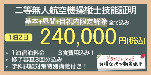・宿泊無し(通学割り)の場合・・・・上記費用の合計から7,000円減額・二人以上同じ日にて受講(ペア割)の場合・・・・各人の費用から10,000円減額・基本+目視外+夜間をせってで受講(セット割)の場合・・・・総額240,000円